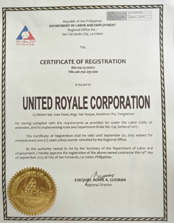 Our company, incorporated in the year 2000, is a licensed outsourcing service provider, duly registered with the Department of Labor and Employment, under Department Order No. 174, Series of 2017, with Permit No. RO1-09-23-00021